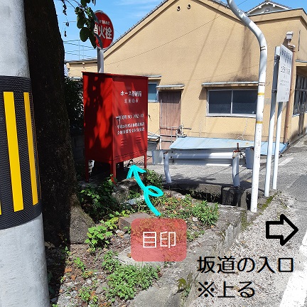 ①坂道の入口への目印は「消火栓」の赤い「ホース収納庫」です